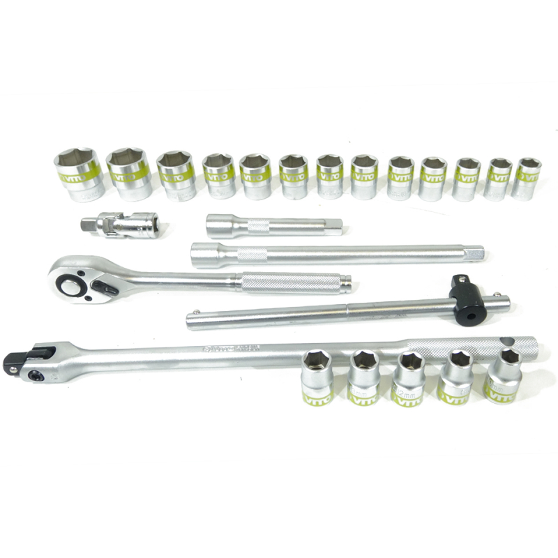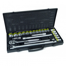 1 clé à cliquet 1/2 "- 18 clés 1/2": 10 · 11 · 12 · 13 · 14 · 15 · 16 · 17 · 18 · 19 · 20 · 21 · 22 · 23 · 24 · 30 · 32 mm - 2 rallonges: 125 mm · 250 mm - 1 barre coulissante 250 mm - 1 clé de serrage 360 mm - 1 clé dynamométrique
