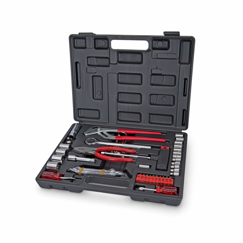Contenu de la mallette 49 OUTILS : 12 douilles 1/4" 4 · 4.5 · 5 · 5.5 · 6 · 7 · 8 · 9 · 10 · 11 · 12 · 13 mm / 4 douilles 3/8" 14 · 15 · 17 · 19 mm / 1 clé a cliquet 3/8" / 1 clé a bougies 16 mm / 1 extension 75 mm / 1 adaptateur 3/8" - 1/4" / 1 pince universelle 150 mm / 5 clés mixtes 8 · 10 · 12 · 14 · 15 mm / 2 tournevis lame plate/phillips / 1 pince multiprise / 8 clés hexagonales 1.5 · 2 · 2.5 · 3 · 4 · 5 · 5.5 · 6 mm / 1 adaptateur pour embouts / 3 embouts plats 3 · 5 · 6 mm / 3 embouts phillips PH1 · PH2 · PH3 / 4 embouts torx T10 · T15 · T20 · T25 / 1 tournevis en T