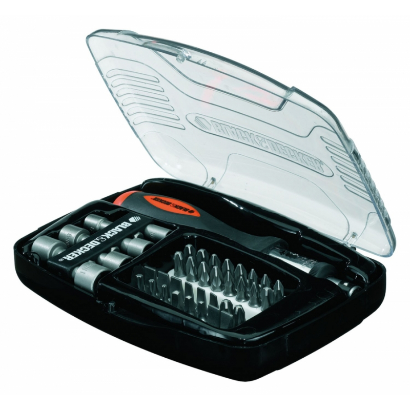 Kit de Tournevis a cliquet Black + Decker A7062-XJ est conçu pour subvenir à tous les besoins de vissage. Cet ensemble de 40 pièces contient :