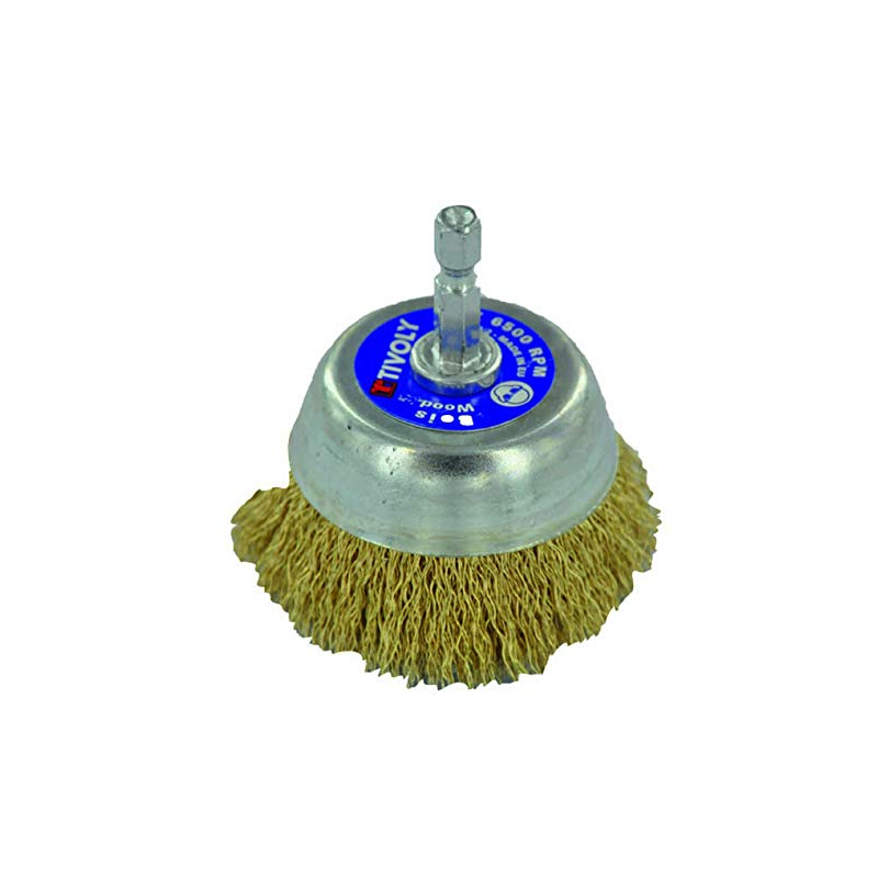 Brosse coupe acier laitonne ondulé Ø75mm, attachement hexagonal 6, 35mm, quick-change, pour perceuse et visseuse.