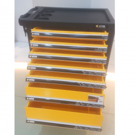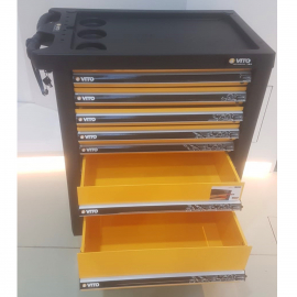 Servante d'atelier Professionnelle VITO 7 tiroirs pour utilisation Professionnelle Structure renforcée Verrouillage des tiroirs - 2 Roues en caoutchouc diamètre 125 mm + 2 roulettes arrières pivotantes avec frein - 5 tiroirs hauteur 65 mm, capacité 25 kg+ 1 tiroir hauteur 135 mm capacité 35 kg + 1 tiroir hauteur 205mm capacité 35kg Système de verrouillage centralisé avec serrure Plateau supérieur avec enduction PVC caoutchouté Surface supérieure de travail pour bricoler et pose d'un étau Côtés perforés pour stockage supplémentaire de pièces ou crochets Tiroirs coulissants avec glissières sur roulement à billes. Dimensions : 770 x 465 x 970 mm Poids: 46kg