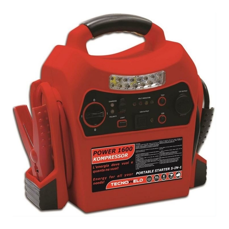 Démarreur portable de batterie de secours POWER 1600 TECNOWELD. Fiable et pratique. Démarre les batteries au plomb 12V jusqu'à 40 Ah. La batterie interne de ce démarreur se recharge via le réseau 230 V ou 12V allume cigare. Équipé d'un système de gonflage pression 8 bar 120 PSI. Prise port USB pour charger les portables. Lampe LED intégrée. Poids 7.5 kg.
