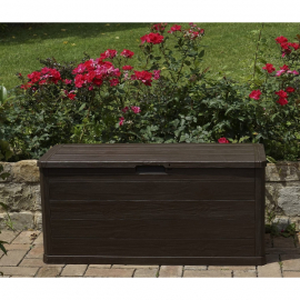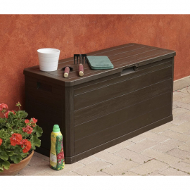 Coffre de rangement pour ranger vos accessoires de jardin. Structure en résine. Résiste au gel, intempéries et UV. Poignées de transport. Cadenassable. Effet bois. 280 L. Dimensions L117xP45xH56 cm. Livré non monté.