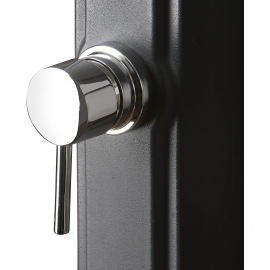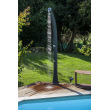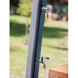 La douche solaire de jardin de la marque GRE. Douche en résine noire, robinetterie en laiton chromé. Réservoir 25 litres. Pommeau de douche anticalcaire + robinet mitigeur pour réguler la température et le débit de l'eau. Equipée d'un robinet lave-pieds. Raccordement tuyau arrosage. Installation simple et facile grâce à l'ancrage au sol. Appareillage haute qualité. Dimensions 19 x 17 x 219 cm.