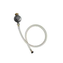 Kit complet de connexion gaz composé d'un détendeur 28 mbar vissable sur bouteille de gaz 13 kg et d'un tuyau gaz flexible en caoutchouc souple de 1.50m de longueur à visser sur l'appareil à gaz type barbecue gaz , réchaud à gaz , plancha gaz et chauffage à gaz .