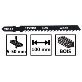 Lot de 5 lames bois VITO pour scie sauteuse. Lame de 100mm de longueur. Epaisseur de coupe comprise entre 5 et 50mm. Emboîtement Bosch VB144.