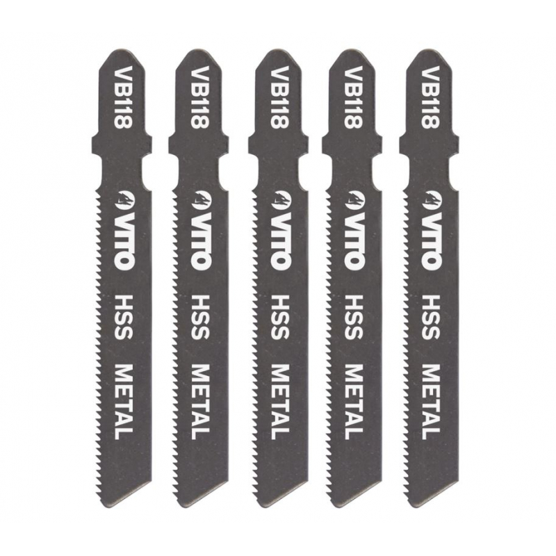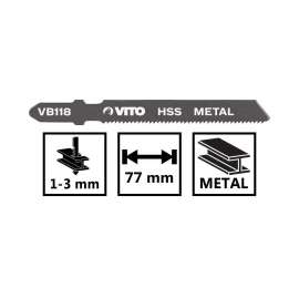 Lot de 5 lames métal pour scie sauteuse. La lame mesure 77 mm de longueur pour une coupe comprise entre 1 et 3mm d'épaisseur. Emboîtement Bosch VB118.