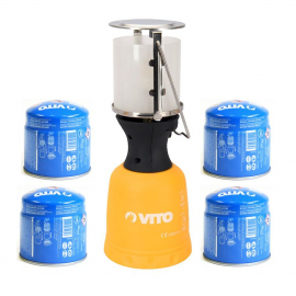 Lampe à gaz Camper Gaz + 4 cartouches de gaz 190 g. Coque inox verre pyrex robuste. Fonctionne avec une cartouche de gaz perçable 190 g. Allumage piezo. Luminosité réglable. Type de gaz : Butane MIX ou butane. Consommation de gaz : 24 g/h. Garantie : 2 ans. Conforme Norme EN521. UE 2016/426.