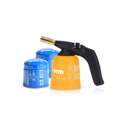 Lampe à souder VITO. Allumage piezo coque ABS + 2 Cartouches gaz 190 gr standard. Polyvalente, pour tous travaux avec verrou de sécurité insert gaz.