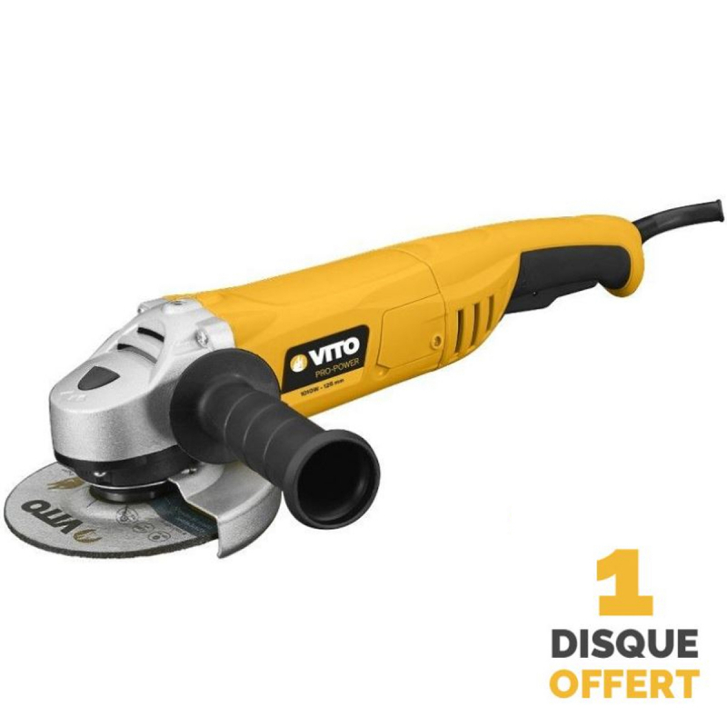 La meuleuse VIRE12510A de la marque VITO délivre une puissance de 1000W. Elle est spécialement conçue pour des disques de 125mm de diamètre. Pour l'achat de cette meuleuse, un disque à tronçonner VITO 125mm vous est fourni, ainsi qu'une clé et un jeu de charbon.