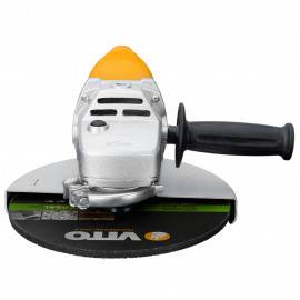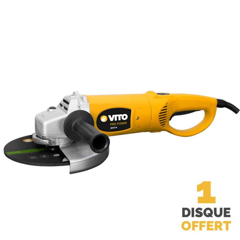 La meuleuse VIRE23020 de la marque VITO délivre une puissance de 2000W. Elle est spécialement conçue pour des disques de 230 mm de diamètre. Pour l'achat de cette meuleuse, un disque à tronçonner VITO 230 mm vous est fournis, ainsi qu'une clé et un jeu de charbon.