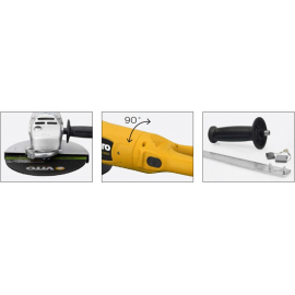 Meuleuse d'angle 2200W VITOPOWER. Vitesse de rotation jusqu'à 6200 tour/min. Triple position de la poignée. Boite d'engrenage en acier. Système ISP de blocage du disque. Clé et jeu de charbon.