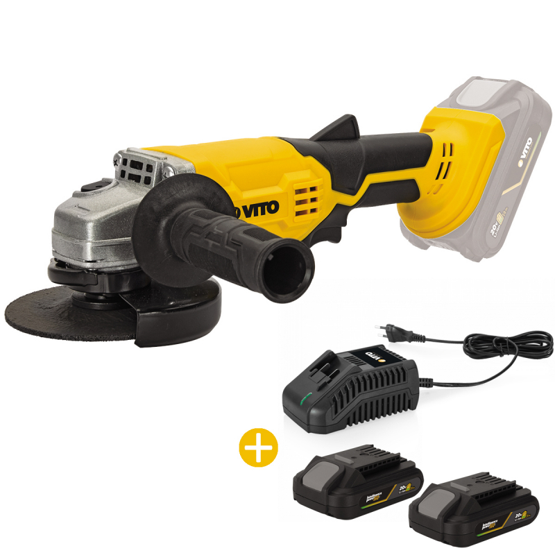 Meuleuse angulaire sans fil 20V Lithium ion VITO EGO LI + 2 batteries 2Ah + chargeur rapide. Diamètre de disque 115 mm, vitesse de rotation 10000 tr/min. Fonctionne avec les batteries lithium-ion compatibles avec tous les outils de la gamme VITO EGO LI 20V.