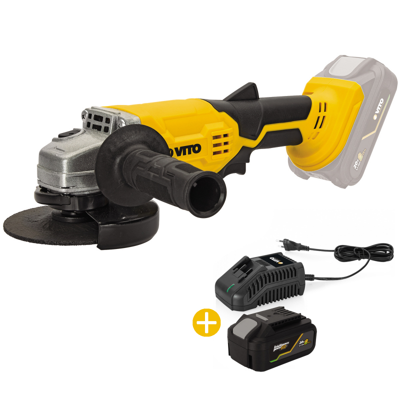 Meuleuse angulaire sans fil 20V Lithium ion VITO EGO LI + batterie 4Ah + chargeur rapide. Diamètre de disque 115 mm, vitesse de rotation 10000 tr/min. Fonctionne avec les batteries lithium-ion compatibles avec tous les outils de la gamme VITO EGO LI 20V.