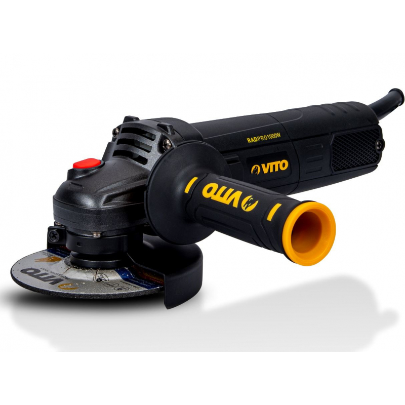 Meuleuse d'angle VITO 1000W pour disque 115mm. Moteur robuste calibré pour une grande performance de coupe. Idéal pour travaux de chantier et ateliers. Réglage facile et rapide du carter de protection. Dispositif de blocage de la broche. Livrée avec sa poignée latérale 2 positions. Poids : 2.03 kg