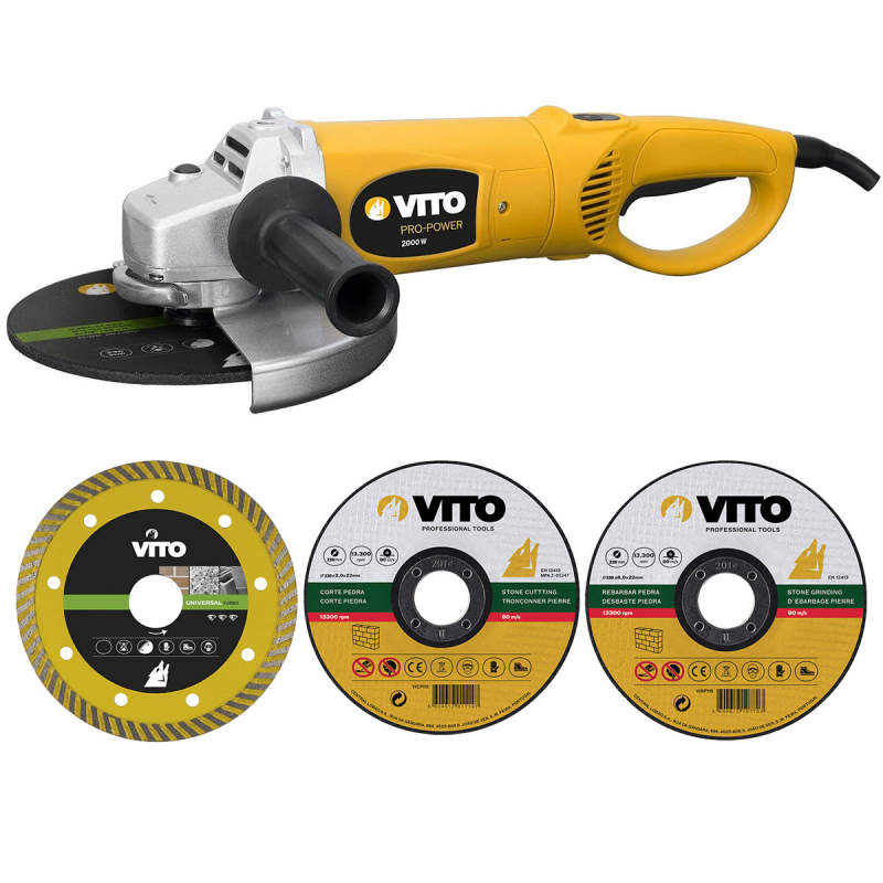 Meuleuse d'angle électrique VITO 2200W. Vitesse de rotation jusqu'à 6200 tour/min. Triple position de la poignée. Système ISP de blocage du disque. Clé et jeu de charbon. Contient 3 disques. 1 Disque diamant universel 230 mm turbo pour travailler la pierre, le marbre, le granit. 1 Disque à ébarber la pierre Ø 230 mm. 1 Disque à tronçonner la pierre Ø 230 mm. Poids : 5.7 kg.