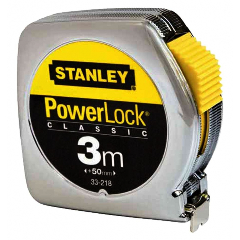 Mètre mesureur de 3 mètres. Marque Stanley. Boîtier en plastique. Ruban en acier carbone recouvert de Mylar®. Clip d'accrochage.