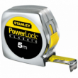 Mètre mesureur de 5 mètres. Marque Stanley. Boîtier en plastique. Ruban en acier carbone recouvert de mylar. Clip d'accrochage.