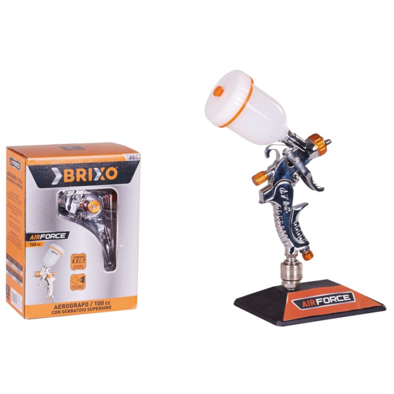 Pistolet à peinture à air comprimé BRIXO. Carrosserie. Peinture Industrielle. Travaux de bricolage pour les particuliers. Cuve supérieure. Capacité du réservoir 0.6 litre. Goupille en acier inoxydable. Trou de buse de 1.5 mm. Raccord fileté M 1/4.