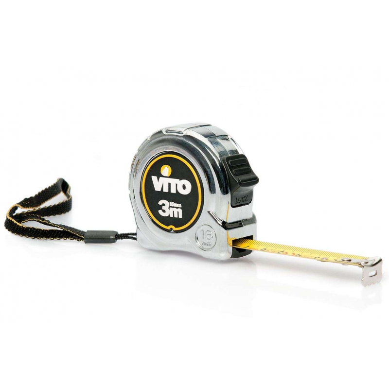 Mètre Ruban VITO en acier chromé rétractable de 3 Mètres avec languette d'accrochage et bouton de blocage. Idéal pour vos travaux de précision, vos mesures professionnelles et très utile pour la maison. Boitier métal haute résistance. Dimensions 3 mètres de long et 16 mm de largeur.