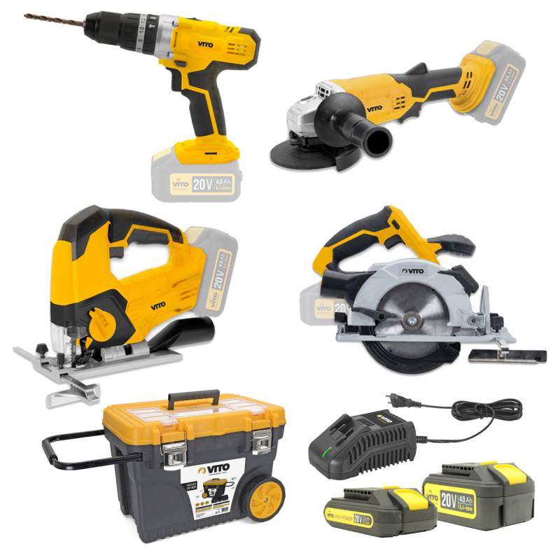 Pack 4 outils sans fil 20 V EXCEPTIONNEL de la gamme VITOPOWER composé d'une scie sauteuse, d'une scie circulaire, d'une perceuse/viseuse, d'une meuleuse et 2 batteries 4.0 Ah et 2 Ah + un chargeur rapide + Roulante de chantier 595 x 380 x 420 mm . Hautes performances et bonne fiabilité -