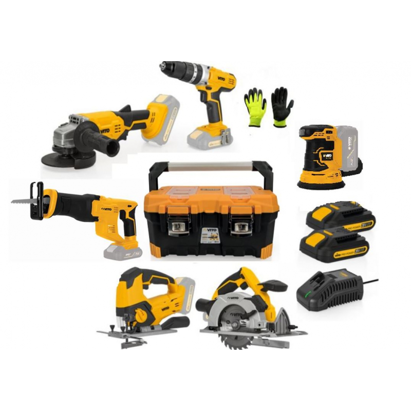 SUPERPACK 6 outils sans fil 20 V GAMME EGO VITOPROPOWER composé 1 scie sabre, 1 ponceuse orbitale, 1 scie sauteuse, 1 scie circulaire, 1 perceuse/viseuse, 1 meuleuse, 1 Coffret de rangement 500 x 290 x 250 mm, 1 paire de gants VITO + 2 batteries 2.0 Ah + 1 chargeur rapide + Caisse à outils VITO avec poignée renforcée.