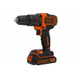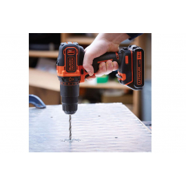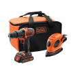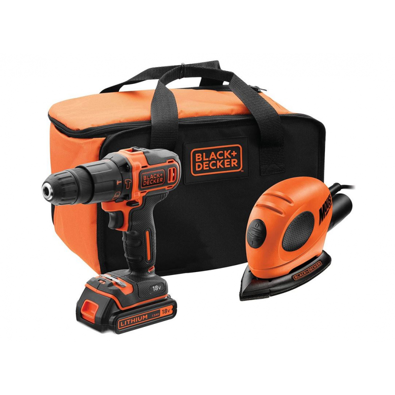 Pack contenant 2 outils BLACK et DECKER Perceuse à percussion 18V + batterie Lithium 1,5 Ah - Mandrin auto-serrant sans clé 10 mm - percussion 0-21 000 coups / min., Couple de serrage 17,5 / 40 Nm - 2 vitesses mécaniques + Ponceuse Mouse 55 watts 11000 tr / min - Accessoires de ponçage assortiment de feuilles abrasives sous différentes tailles + Sac semi rigide à fermeture.