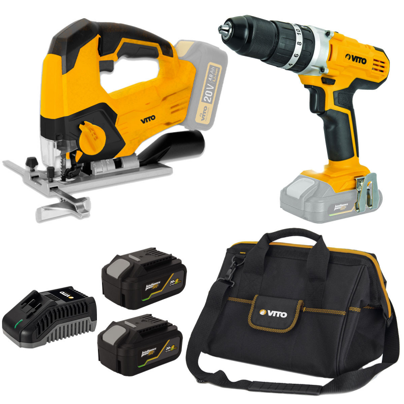 Pack 2 outils complet VITO PRO-POWER de la gamme à batterie 20 V VITO EGO composé d'une scie sauteuse et d'une perceuse/visseuse. Ce pack vous est livré avec deux batteries au lithium de 4 Ah, un chargeur rapide et une sacoche pour ranger vos outils.