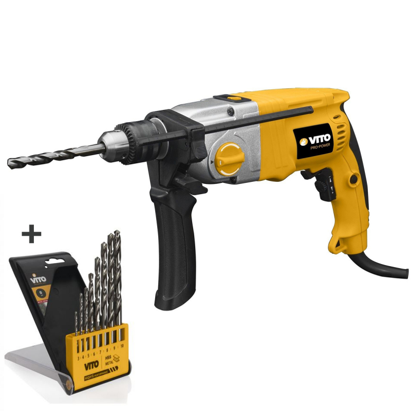 Perceuse à percussion de 1050W de VITO + Coffret 8 forets acier inclus. Réglage de la rotation jusqu'à 4800 tr/min. Mandrin de 2 à 13 mm. Perce le bois jusqu'à 30mm, le métal jusqu'à 13mm et le béton jusqu'à 20mm. Guide de profondeur et poignée auxiliaire fournis.