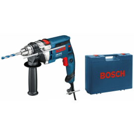 Perceuse à percussion filaire GSB 16 RE Professional 750 W de BOSCH. Tension 230V. Puissance 750W. Vitesse 2 800 trs/min. Percussion 47 600 coups/min. Couple 2,3 Nm. Mandrin sans clé.Ø béton 16 mm. Ø bois 30 mm. Ø acier 13 mm. Ø maçonnerie 18 mm. Poids 2,2 kg .