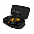 Mini outil articulé sans fil 4V avec batterie Lithium-ion 1.5 Ah rechargeable. Outil polyvalent de coupe et de vissage sur la même machine Ce nouvel outil est conçu avec des embouts spécifiques escamotables qui offrent des fonction très pratiques. Avec la même machine vous pouvez visser de face et de coté pratique pour s'adapter à toutes les situations .Équipé d'une lumière LED pour éclairer la zone de travail. Couple de travail : 4 Nm Vitesse de rotation : 200 tours / minute Livré dans une pochette de rangement avec un chargeur + 26 Embouts de vissage longueur 25 mm + 4 adaptateurs spécifiques + 1 Extension Magnétique + 2 embouts longueur 50 mm Dimensions du produit : 130x35 115 mm Poids : 0,375 kg