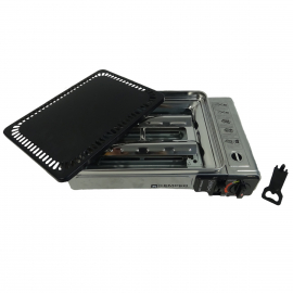 Équipé d'un brûleur à gaz en acier inoxydable, d'une valve de sécurité contre les risques de surpression et d'un réglage de la température de cuisson.