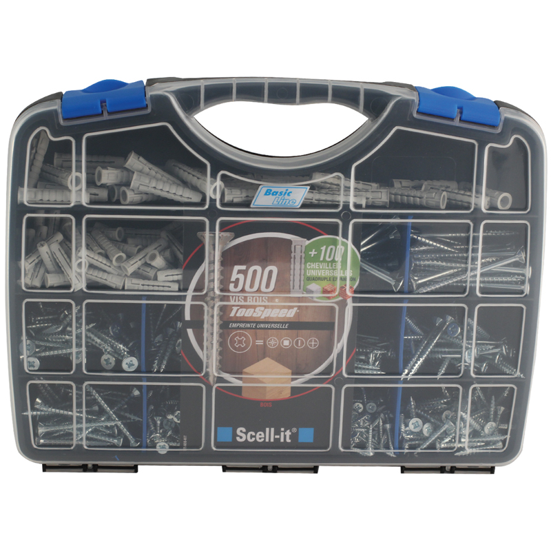 Coffret SCELL-IT composé de 1 embout de vissage, 500 vis à empreinte universelle (panaché de taille), 100 chevilles universelles quadruple expansion (70 chevilles Ø6 + 30 chevilles Ø8) en polypropylène pour charge légère dans le béton, la maçonnerie pleine et creuse, le plâtre et le parpaing creux.