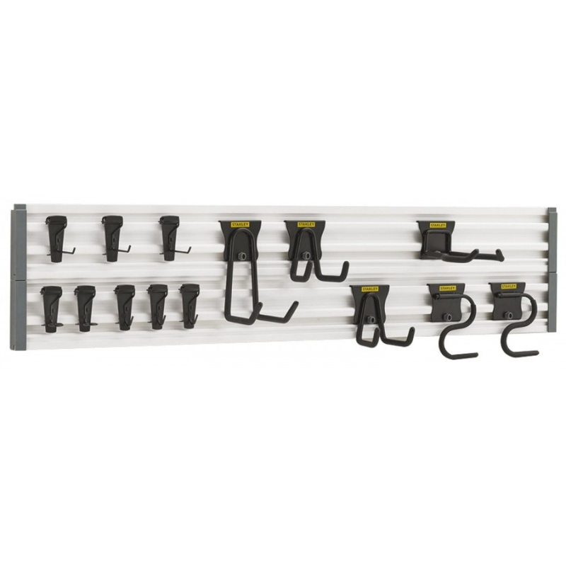 Ensemble de rails STST-22000-1 de STANLEY. Solution de rangement. 2 rails de 120 cm. 2 crochets en "S". 2 crochets courts. 1 crochet pour outils de jardin. 1 crochet long. 1 paquet. 8 petits crochets. 1 paquet. 4 bouchons de fermeture. Poids 7kg