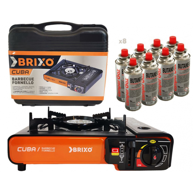 Réchaud à gaz 2200w portable CUBA + 8 bouteilles de gaz camping 250gr. Système d'allumage piézo avec levier de verrouillage et support casserole Corps en Acier robuste et résistant - Consommation de gaz 160 gr/h