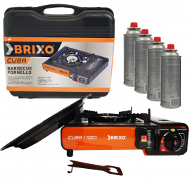 Pack combiné BARBECUE gaz GRILL portable à gaz + Réchaud gaz CUBA 2200 W + 4 bouteilles de gaz butane UN 2037 standard de 250 g butane camping. Équipé d'un système d'allumage piézo. Combiné grill + réchaud à gaz. Appareil de cuisson conforme au normes européennes pour votre sécurité. Mallette de transport et de rangement.