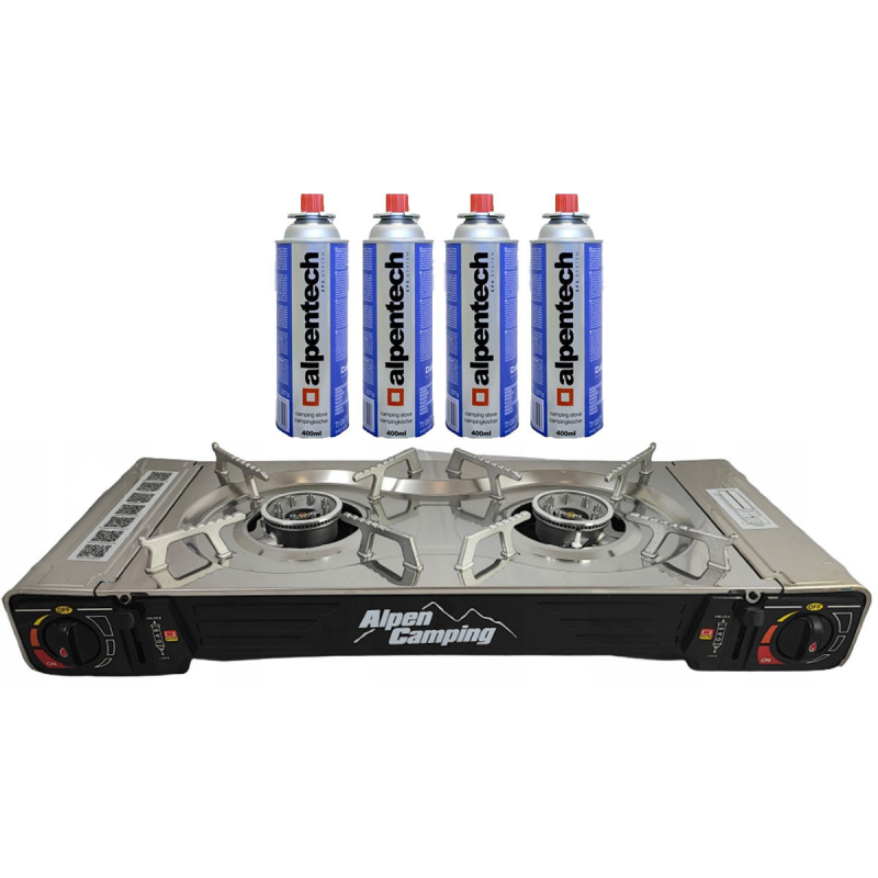 Réchaud double portable ALPEN CAMPING Puissance 4600W (2300W x2). Allumage piezo. Structure en INOX et ALUMINIUM haute qualité. Durable et robuste. Fonctionne avec 1 ou 2 cartouches de gaz butane standard selon utilisation d'1 ou 2 feux. Vendu avec 4 cartouches de gaz butane 250 gr. Dimensions : 62,4 x 27.7x 12,5 cm.