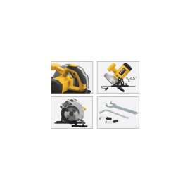 Scie circulaire de 1200 W. Vitesse de rotation du disque: 4600 tr/min. Équipée d'un disque de 185 mm de d'amètre avec 24 dents. Réglage de l'inclinaison de la découpe jusqu'à 45°. Corps de l'appareil en aluminium. Clés et jeu de brosses de charbon fournis.