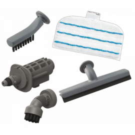Livré avec : 1 chiffon microfibre rectangulaire, élément adaptateur pour l'utilisation du générateur avec accessoires; Accessoire nettoyant pour vitres, brosse ronde et brosse à joints