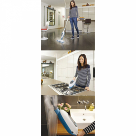 Le nettoyeur de sol à vapeur Black + Decker FSMH13E, élimine 99,9% des germes et des bactéries. Utilisation avec l'eau du robinet. Réservoir amovible. Capacité 380 ml. Puissance 1300 Watt. Tête articulée. Générateur de vapeur amovible. Câble de 7 m.