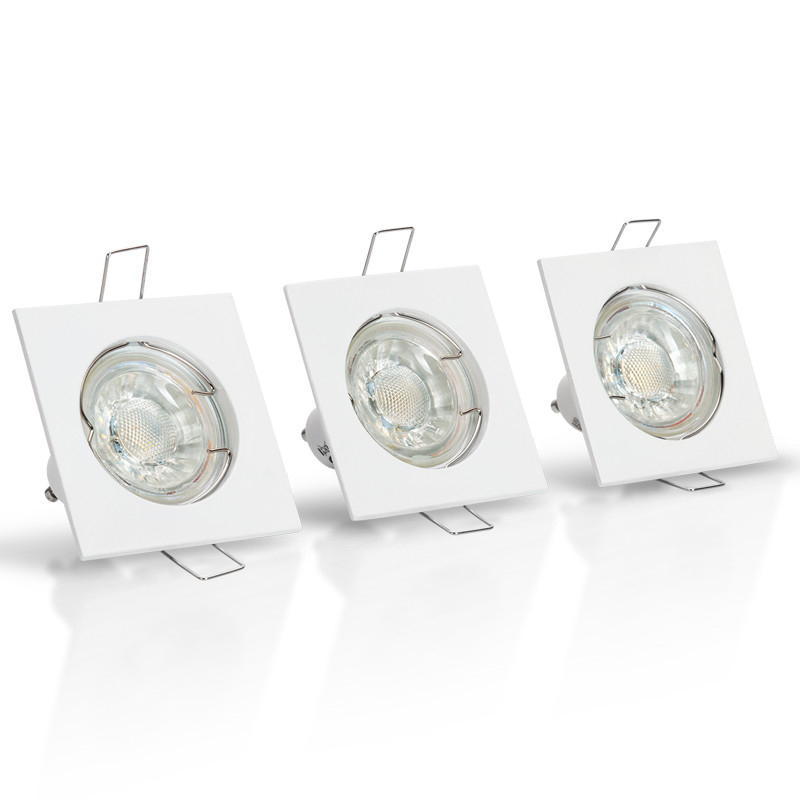 Jeu de 3 anneaux carrés 75 x 75 mm à encastrer ASLO. 6W. 230V. 50/60Hz. Lumens 400. 4000 K : Éclairage Blanc neutre. Éclairage de haute qualité pour des environnements nécessitants beaucoup de lumière tels que les bureaux. Angle d'ouverture 26°. Corps en aluminium, diffuseur en verre. Couleur blanc. Puce LED 2853 SMD. Utilisation : 30 000h. Nombre de cycles (marche/arrêt) 15 000. Profondeur 24mm. Poids 0.42kg.