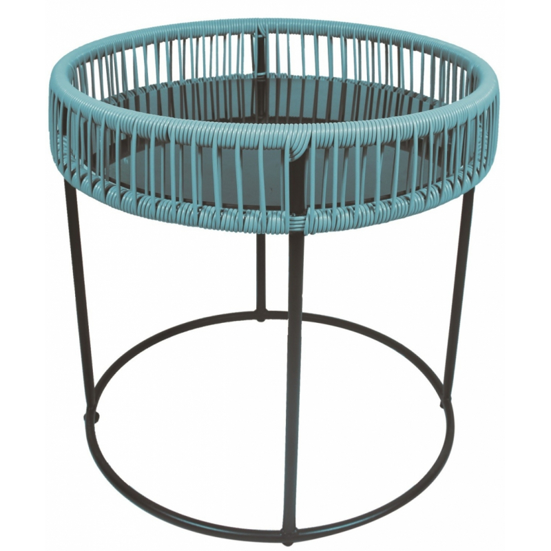 Table basse de jardin en fil métallique tressé GARDEN DELUXE. Dimensions Ø50xH50cm. Couleur bleue plateau verre 5mm. Structure en acier.