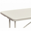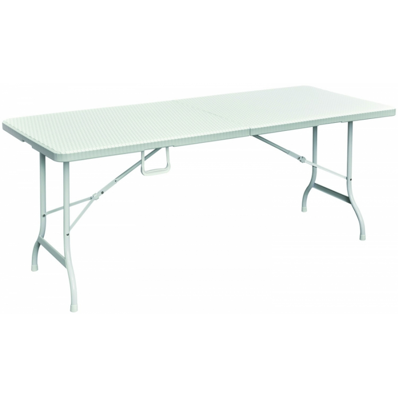 Table pliante rectangulaire blanche GARDEN DELUXE structure pliante en acier laqué époxy. Plateaux en résine effet rotin. Couleur blanche. Joint avec chevilles en acier pour une résistance maximale au poids. Poignée de transport pour mallette de transport. Fermeture à emboitement. Dimensions de la table : 180x75xH72cm. Camping Réceptions festivals évènements.