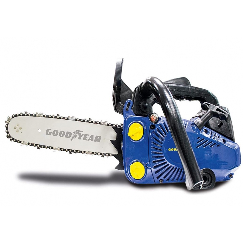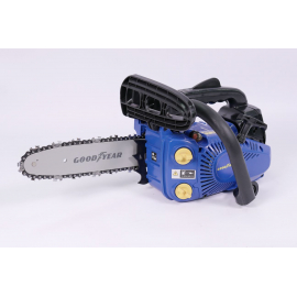 Tronçonneuse élagueuse THERMIQUE GOODYEAR avec moteur 2 TEMPS, 25.4 cm3, 700W, avec système anti vibration intégré et démarrage facile. Longueur de la lame 25 cm. Lubrification automatique de la chaîne, pompe à huile réglable, chaine de recul et frein mécanique. Maillons de chaine 3/8 LP. Sangle de maintien, chaîne et réservoir de remplissage de carburant inclus.