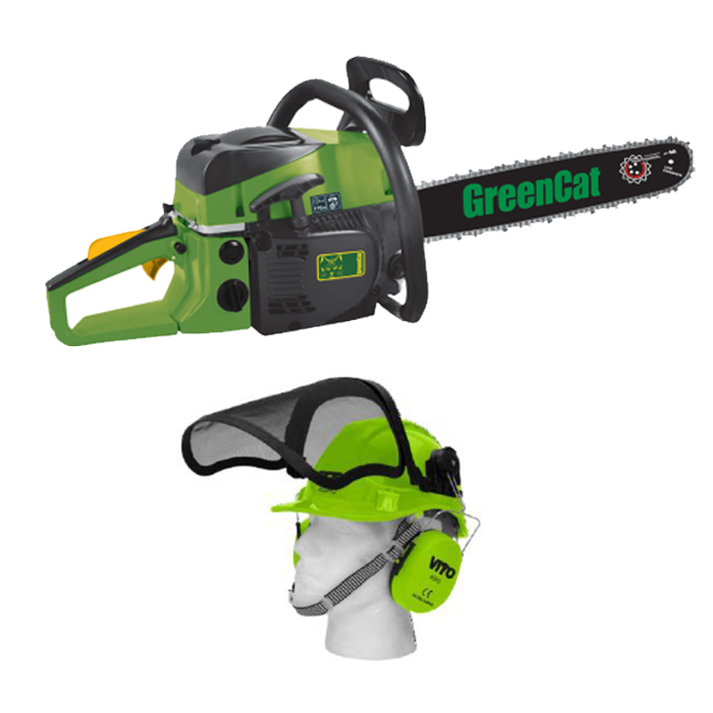 Tronçonneuse thermique 52 CC GREENCAT : Moteur 2T - 1.2 CV - 1.7 kW - Lame 50 cm - Carburateur WALBRO - Graissage auto chaine - Contrôle niveau d'huile - Anti vibration - Pas de chaîne 325 "- 18" - Vitesse 8000 trs/mn - Poignée anti glisse - Réservoir d’huile 260 ml - Réservoir carburant 550 ml - Poids 7 kg.