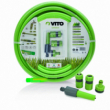 Kit d'arrosage jardin complet de 25 mètres haute qualité de la gamme VITO GARDEN en diamètre 19mm composé d'un tuyau PVC renforcé tri couches avec fibre de polyester . Système d'arrosage haute résistance anti uv long 25m + lance auto + 2 raccords automatiques Ø 19mm + nez de robinet automatique.