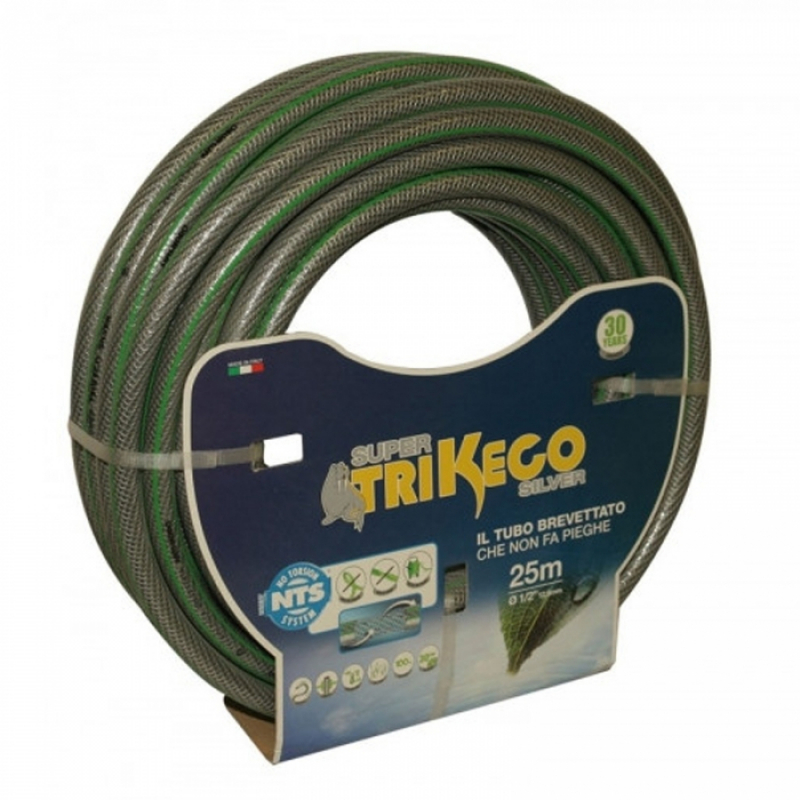 Tuyau d'arrosage TRIKECO 5 couches. Ø 13 mm. Longueur 15m. Haute qualité. Traité anti algues. Anti-noeud. Anti-froissement. Souple et flexible, il répondra aux attentes des plus exigeants. Couche interne blanche non toxique, couche noire anti-algues, maille interne NTS (sans système de torsion), extérieur couleur cristal métallique avec 2 lignes vertes. Résistant aux températures + 60 ° C -20 ° C. Pression 25 Bar, 1/2 ".