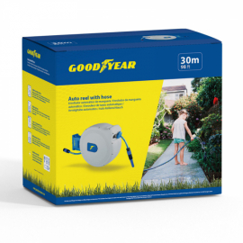 Tuyau d'arrosage sur dévidoir mural GOODYEAR. Longueur 30 m. Rembobinage automatique. Matière : PVC. Ø 13 mm - 1/2". Support mural : Rotation à 180°. Extension de tuyau : 2 m jusqu'au raccord. 4 embouts. Température d'utilisation : - 10°C à 50 °C.