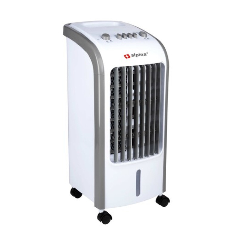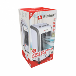 Rafraichisseur d'air ALPINA. 3 en 1. Ventilateur, refroidisseur d'air, humidificateur. Puissance 80W. 3 vitesses. Capacité du réservoir d'eau : 4L. Fonction oscillation. Silencieux : 61 dB(A). Facilement transportable. Dimensions : 57 x 24 x 26 cm. Poids 4 kg.