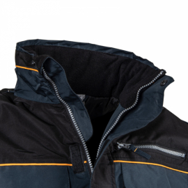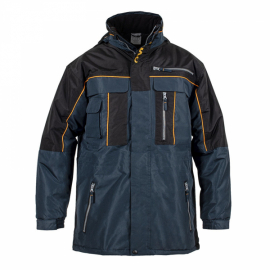 Veste de travail VITO SECURITY 100% Polyester avec revêtement en PVC. Taille M. Bleu et noir. Imperméable. Conçue pour les travaux en extérieur en hiver (basses températures). Ceinture élastique. Fermeture éclair avec rabat à scratch. Quatre poches avec fermeture éclair. Trois poches avec rabat de serrage à scratch. Capuche amovible avec la doublure en polaire. Col avec une doublure en polaire.